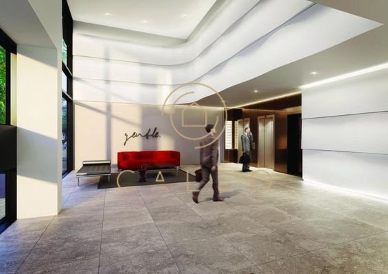 Die lichtdurchflutete hochmoderne und sehr repräsentative Lobby besticht durch ihre zeitlose Eleganz. Neben der Verwendung von hochwertigen Materialien wie einem hellgrauen Terrazzo-Boden und beleuchteten Highmax-Elementen an den Wänden steht bei "gentle...