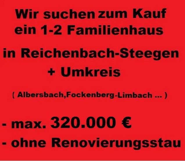 ObjektbeschreibungWir suchen für eine amerikanische Familie mit 2 Kindern ein 1-2 Familienhaus zum Kauf in Reichenbach-Steegen und Umkreis( Albersbach, Fockenberg-Limbach,... )Da die Kinder in Reichenbach-Steegen zur Schule und in den Kindergarten gehen,...