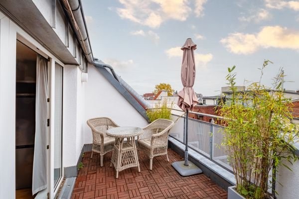 Die helle und gepflegte Dachgeschosswohnung befindet sich im Vorderhaus eines repräsentativen Gebäudes. Der Dachausbau erfolgte Ende der 1990er. Mittelpunkt der Wohnung bildet die offene Küche mit Kücheninsel und Essbereich. Von hier lassen sich das Wohn-...