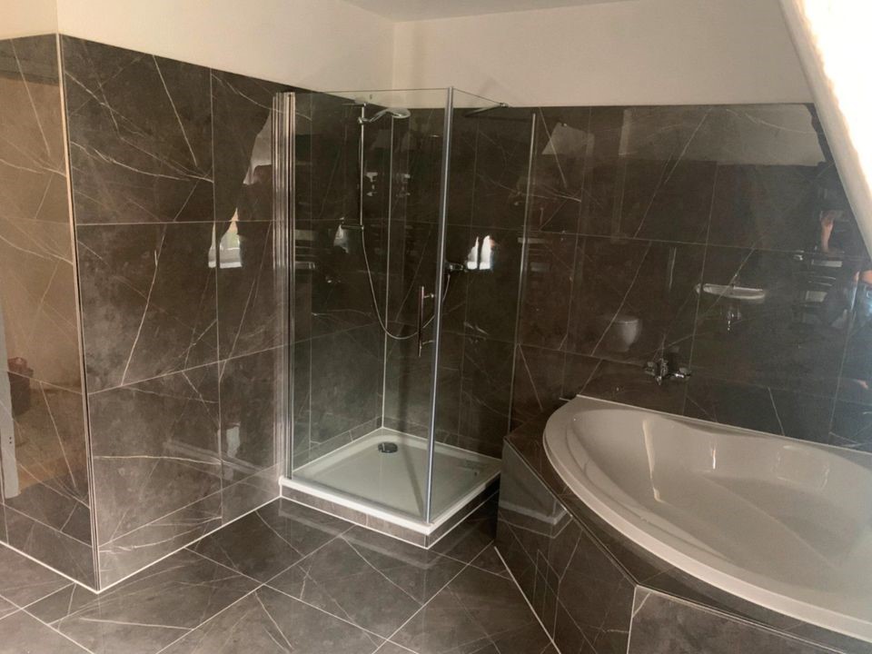 Burg, provisionsfrei, modernisierte helle 3 Raum Wohnung im Dachgeschoss, 82 qm Wohnfläche, sanierter Altbau, Bad modernisiert mit großformatigem Hochglanz poliertem Feinsteinzeug, große Eckbadewanne, Dusche, Handtuchhalterheizkörper und Fenster, gefliest...