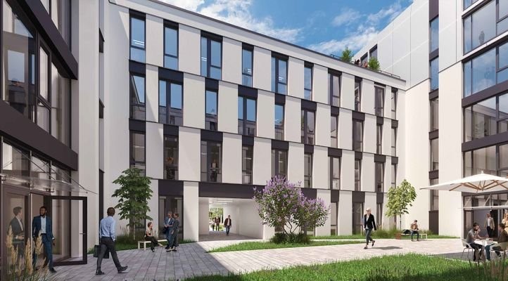 Das kommunikative Herzstück im Objekt ist der begrünte, ruhige Innenhof. Ein offener Open-Air-Space für Austausch und Begegnung, für informelle Meetings, für Lunch oder Afterwork-Veranstaltungen. Ein Ort, an dem die Idee des New Work zum Leben gebracht wi...