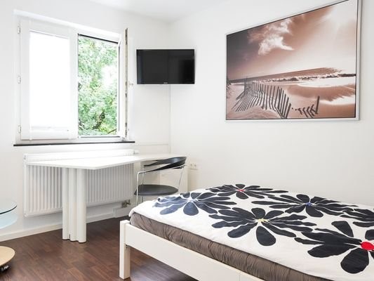 freundliche 2-Zimmer-Wohnung in Stuttgart-West, ca. 53 m², 2. OG, Wohnzimmer mit Esstisch, Schlafcouch, Schlafzimmer mit 1,40 m-Bett, großer Schiebetürenschrank, Schreibtisch, WLAN, TV, Küche, kleiner Balkon, Waschmaschine...