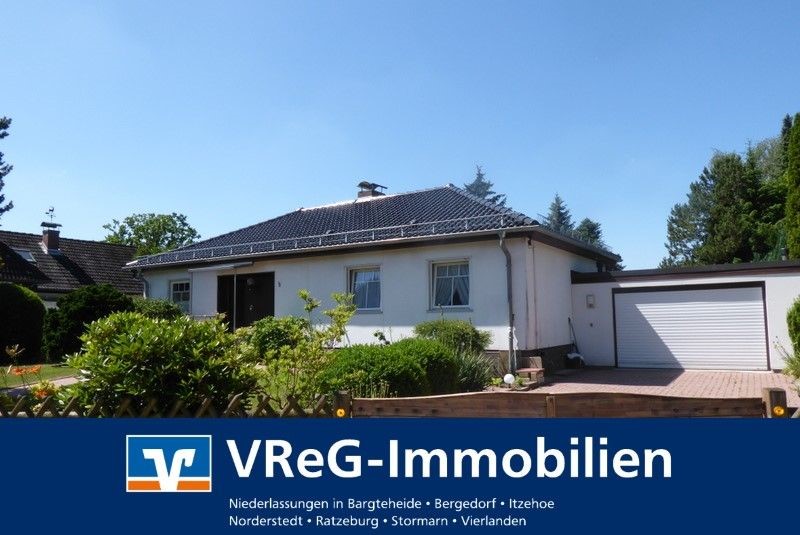 ObjektbeschreibungDieses charmante Einfamilienhaus im Bungalowstil bietet ein entspanntes Wohnen in absolut ruhiger Lage vor den Toren Hamburgs. Umgeben von einem großen grünen Garten, der etwas Pflege im Frühjahr braucht, strahlt das Anwesen eine besonde...