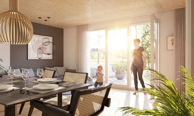 Projekthighlights:Designhaus mit moderner Ausstattung: Fußbodenheizung, elektrische Rollläden, sichtbare Holzdecken, buchbares Möbelkonzept, voll ausgestattetes Designbad, intelligentes Smart-Home-SystemNachhaltiges Energiekonzept: KfW40-NH, Wärmepumpe, P...