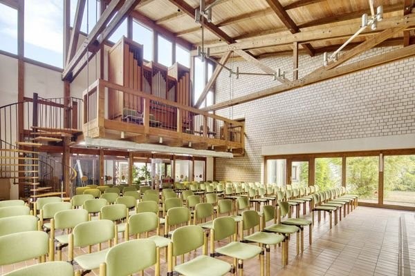 Bisher als evangelisches Gemeindezentrum genutzte Immobilie in Erftstadt-Gymnich, Baujahr 1982, Kalksandstein-Massivbau mit besonderer Architektur und Pultdach, ca. 360 m² ebenerdige Nutzfläche zuzüglich ca. 26 m² Empore, 5 Räume (großer Saal und offenes...