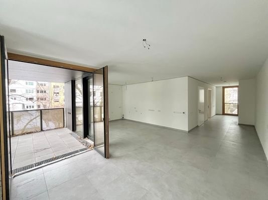Der offene Wohn-, Ess- und Kochbereich bietet ein helles und einladendes Ambiente. Die Küche wird ohne Einbauten vermietet und somit haben Sie die Möglichkeit Ihren eigenen Stil einzubringen. Von der Küche haben Sie Zugang auf die Terrasse, welche sich pe...