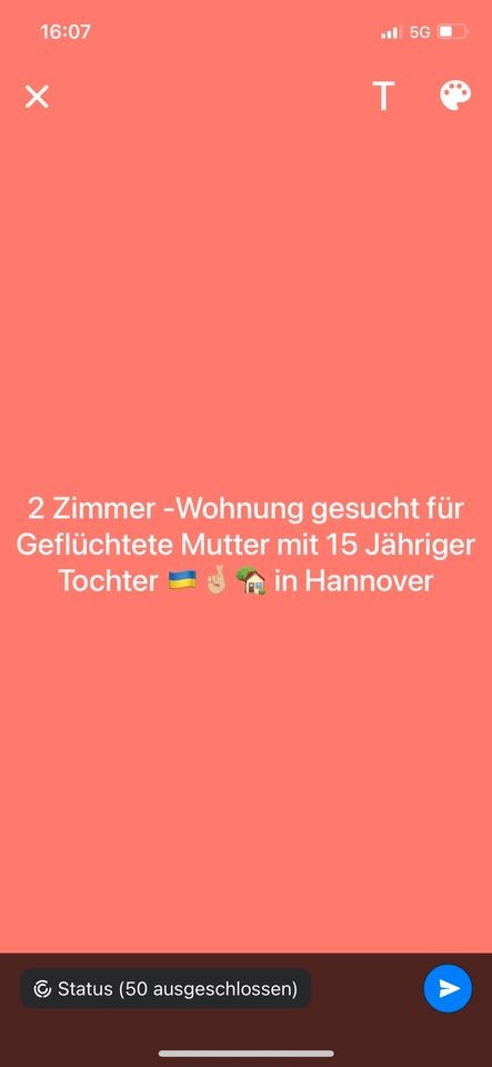 Ich Suche für eine Geflüchtete mit 15 Jähriger Tochter eine Mietwohnung (2 Zimmer) in Hannover.Bevorzugte Stadtteile:KleefeldHeideviertelSüdstadtKirchrodeWohnfläche bis 60mMiete inkl NK 580...